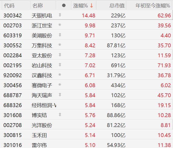 消息面上,自动驾驶公司小马智行与北汽新能源日前宣布,双方将基于L4级Robotaxi规模化量产和运营 的成功经验,全面扩大合作广度与深度,聚焦自动驾驶的量产化、商业化与全球化。 | 代码 | 名称 | | 涨幅% ↓ | 总市值 | 年初至今涨幅% | | --- | --- | --- | --- | --- | --- | | 300342 | 天银机电 | 1 | 14.48 | 229亿 | 62.96 | | 002703 | 浙江世宝 | 兼 | 9.98 | 237亿 | 39.56 | | 603319 | 美湖股份 | 1 | 9.71 | 130亿 | 4.40 | | 300552 | 万集科技 | 换 | 8.42 | 87.81 亿 | 35.70 | | 002284 | 亚太股份 | 1 | 7.28 | 123亿 | 11.59 | | 002195 | 岩山科技 | 1 | 7.02 | 691亿 | 71.93 | | 920092 | 汉鑫科技 | 来 | 6.71 | 31.79亿 | 36.78 | | 300456 | 塞微电子 | 张 | 6.08 | 434 乙 ...