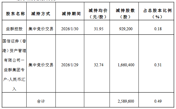 核心观点 - 控股股东及其一致行动人近期执行了新一轮股份减持计划 累计减持公司股份2,589,600股 占总股本0.49% 套现金额约84,049,436元 本次减持计划尚未实施完毕 [1][2][3][4] - 控股股东在2025年9月已完成一轮大规模减持 累计减持股份11,939,400股 占总股本2.25% 套现金额约423,803,741.84元 [4][5] 股东权益变动详情 - 控股股东益群控股于2026年1月30日通过集中竞价减持929,200股 占总股本0.18% 减持均价31.95元/股 套现29,687,940元 [2][3] - 一致行动人“国信证券(香港)资产管理有限公司-益群集团专户-人民币汇入”于2026年1月29日通过集中竞价减持1,660,400股 占总股本0.31% 减持均价32.74元/股 [2][3] - 本次权益变动后 益群控股合计持有公司106,129,803股 占总股本比例由20.18%降至20.00% 仍为持股5%以上股东 [1][3] 历史减持情况回顾 - 2025年9月期间 益群控股通过集中竞价及大宗交易方式累计减持11,939,400股 占总股本2.25% [4] - 集中竞价减持分两次进行:9月3日减持2,200,000股均价41.2717元 9月8日减持3,106,400股均价40.9831元 [5] - 大宗交易减持分三次进行:9月11日减持408,000股均价37.20元 9月17日减持235,000股均价36.86元 9月24日减持5,990,000股均价30.36元 [5] 公司治理与股权结构 - 公司实际控制人为周志群 其持有控股股东益群控股100%股权 [4] - 公告指出 本次权益变动不会导致公司控股股东及实际控制人变化 不会对公司治理结构及持续经营产生影响 [4]