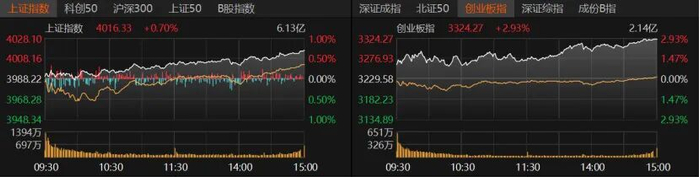 受访人士表示,目前政策面、经济基本面、资金面和外部环境改善的可能性都对市场形成了较强的支 撑。经过前期的盘整和消化,市场具备了一定的上行空间。他们建议投资者采取"哑铃型"配置策略,兼 顾科技成长股与红利价值股。 局部热 今日,沪指收涨0.7%报4026.33点,创业板指收涨2.93%报3324.27点,深证成指涨近2%。科创50、沪深 300、上证50收涨,北证50更是大涨超8%。 市场交易活跃度显著提升,今日成交额达到2.29万亿元,较昨日的2.17万亿元略有增长。杠杆资金热度 不减反增,沪深京两融余额增至2.49万亿元。 银行股领跌,通信设备、电源设备、英伟达概念、新型工业化、基本金属等板块领涨。 10月29日,A股走高,指数大涨,沪指突破4000点,创业板指涨近3%,北证50涨逾8%。不过,市场整 体呈现出"局部牛市"的特征,仅有2672只个股收涨。其中,电力设备、有色金属等热门赛道表现尤为亮 眼。 | | 东财概念荆数 | | | 东财行业指数 | | | A股市场接心指数 | | | --- | --- | --- | --- | --- | --- | --- | --- | --- | | | ...