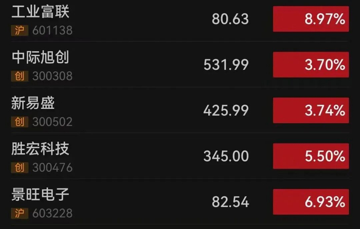 编 辑|钉钉 10月29日,算力硬件股集体高开,工业富联、中际旭创、新易盛等多股再创新高,工业富联大涨近 9%;胜宏科技、景旺电子、生益电子多股高开。 | 工业富联 | 80.63 | 8.97% | | --- | --- | --- | | 沪 601138 | | | | 中际旭创 | 531.99 | 3.70% | | 创 300308 | | | | 新易盛 | 425.99 | 3.74% | | 创 300502 | | | | 胜宏科技 | 345.00 | 5.50% | | 创 300476 | | | | 景旺电子 | 82.54 | 6.93% | | 沪 603228 | | | ...