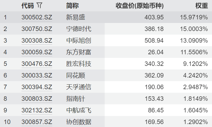 临近上午收盘,光模块指数拉升,中际旭创、新易盛、天孚通信、剑桥科技涨幅居前。 | | 代码 7 | 简称 | 收盘价(原始币种) | 权重 | | --- | --- | --- | --- | --- | | 1 | 300502.SZ | 新易盤 | 403.95 | 15.9719% | | 2 | 300750.SZ | 宁德时代 | 386.18 | 15.0003% | | 3 | 300308.SZ | 中际旭创 | 508.94 | 13.0909% | | ব | 300059.SZ | 东方财富 | 26.04 | 11.5506% | | 5 | 300476.SZ | 胜宏科技 | 340.32 | 9.1202% | | 6 | 300033.SZ | 同花顺 | 362.09 | 4.2420% | | 7 | 300394.SZ | 天孚通信 | 190.06 | 2.9487% | | 8 | 300803.SZ | 指南针 | 153.43 | 1.8149% | | 9 | 302132.SZ | 中航成飞 | 86.45 | 1.6045% | | 10 | 300857 ...