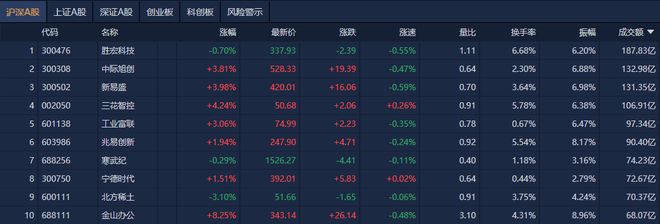 市场整体表现 - 市场早盘震荡拉升,创业板指上涨1.35%,沪指上涨0.21%并站上4000点大关,创十年新高 [1] - 沪深两市半日成交额达1.35万亿元,较上个交易日缩量2156亿元 [4] 板块热点轮动 - 福建板块表现最为强势,平潭发展8天6板,福建水泥和海峡创新均实现2连板 [2] - 核电板块活跃,东方钽业4天3板,安泰科技2连板 [2] - 商业航天板块延续强势,航天智装股价创历史新高 [2] - 算力硬件概念反复活跃,中际旭创股价再度刷新历史新高 [2] - 煤炭板块走弱,大有能源股价触及跌停 [3] 个股成交活跃度 - 胜宏科技成交额超过187亿元,位列两市第一 [4] - 中际旭创成交额132.98亿元,股价上涨3.81% [5] - 新易盛成交额131.35亿元,股价上涨3.98% [5] - 三花智控成交额106.91亿元,股价上涨4.24% [5] - 金山办公股价大幅上涨8.25%,成交额68.07亿元 [5]