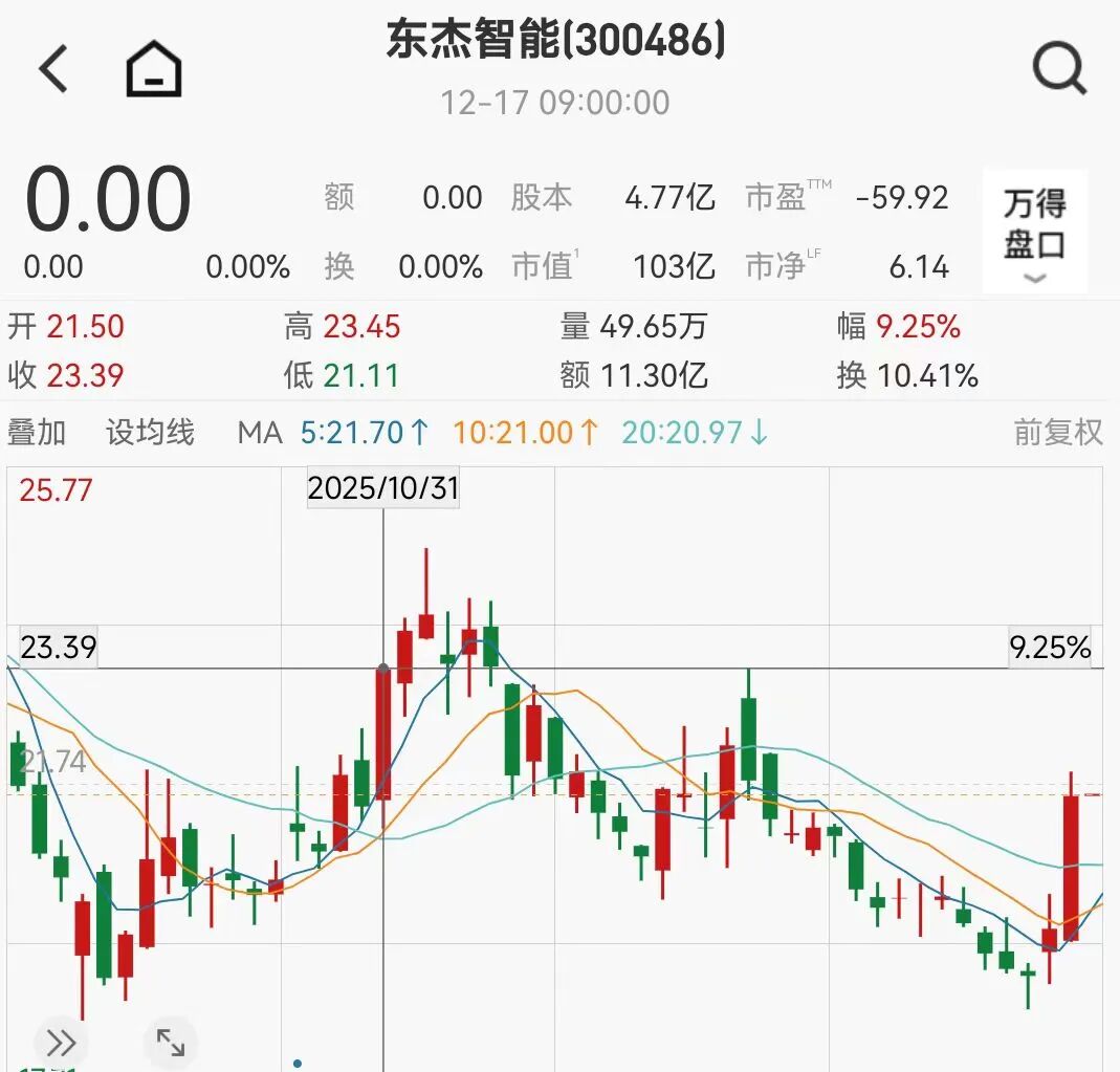 因上述重大资产重组尚存在不确定性,东杰智能股票自12月17日开市起停牌。在二级市场,东杰智能是2025年的"牛股"之一,是机器人概念股,一度创下 28.90元的新高。12月16日,东杰智能股价大涨近10%,收报21.59元/股,年初至今,该公司股票涨幅累计达215.64%,最新市值为103亿元。 刚完成实际控制人变更不久,东杰智能(SZ300486)宣布了一则重大资产重组消息。 12月16日晚,东杰智能称,公司正在筹划发行股份及支付现金购买山东齐康智合创业投资管理有限公司等交易对方合计持有的遨博(北京)智能科技股份 有限公司(以下简称遨博智能)控股权并配套募集资金。本次交易预计构成重大资产重组、构成关联交易,但不构成重组上市。 《每日经济新闻》记者获悉,遨博智能是一家从事协作机器人研发、生产和销售的公司。东杰智能实控人、董事长韩永光间接持有遨博智能约7.17%股 份。 今年10月24日,东杰智能的实控人变更完成,韩永光已实际控制公司日常经营管理。而在更早的今年8月底,韩永光上任了东杰智能的董事长。 遨博智能官网显示,公司拥有全行业最完备的协作机器人和移动操作机器人产品矩阵,实现了伺服电机、减速器、驱动器等核心 ...