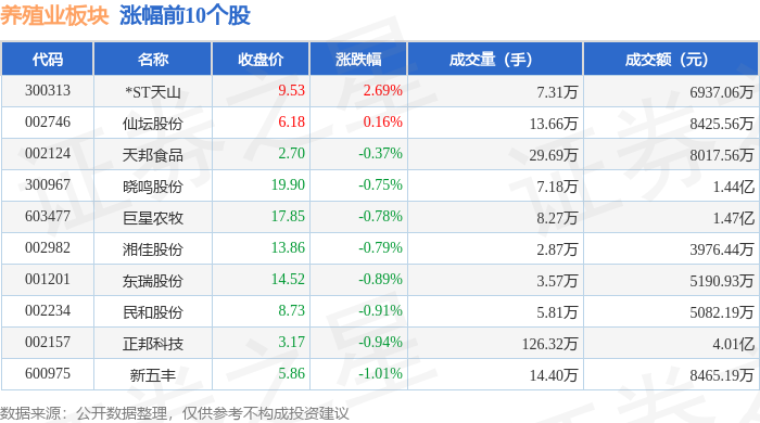 证券之星消息,1月16日养殖业板块较上一交易日下跌2.27%,温氏股份领跌。当日上证指数报收于 4101.91,下跌0.26%。深证成指报收于14281.08,下跌0.18%。养殖业板块个股涨跌见下表: | 代码 | 名称 | 收盘价 | 涨跌幅 | 成交量(手) | 成交额(元) | | --- | --- | --- | --- | --- | --- | | 300313 | *ST天山 | 9.53 | 2.69% | 7.31万 | 6937.06万 | | 002746 | 仙坛股份 | 6.18 | 0.16% | 13.66万 | 8425.56万 | | 002124 | 天邦食品 | 2.70 | -0.37% | 29.69万 | 8017.56万 | | 300967 | 膀ਫ਼股份 | 19.90 | -0.75% | 7.18万 | 1.44亿 | | 603477 | 巨星农牧 | 17.85 | -0.78% | 8.27万 | 1.47亿 | | 002982 | 湘佳股份 | 13.86 | -0.79% | 2.87万 | 3976.44万 | | 001201 | 东瑞 ...