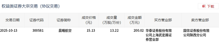 交易概况 - 晨曦航空于2025年10月13日发生一笔大宗交易,成交量为13.22万股,成交金额为200.02万元 [1] - 该笔大宗交易成交价定为15.13元,相较于当日市场收盘价18.29元,存在17.28%的折价 [1] - 此笔交易成交额占该股当日总成交额的0.2% [1] 交易细节 - 交易类型为权益类证券大宗交易(协议交易)[2] - 该笔交易的买方营业部为华泰证券股份有限公司上海武定路证券营业部 [2] - 该笔交易的卖方营业部为国信证券股份有限公司陕西分公司 [2]