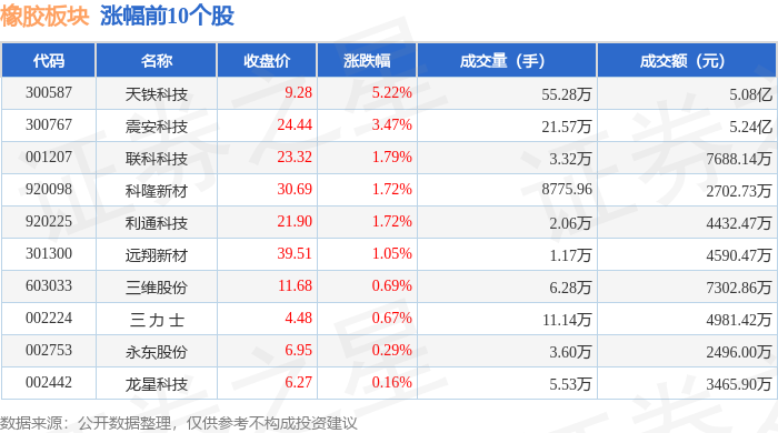 证券之星消息,10月9日橡胶板块较上一交易日上涨0.02%,天铁科技领涨。当日上证指数报收于 3933.97,上涨1.32%。深证成指报收于13725.56,上涨1.47%。橡胶板块个股涨跌见下表: | 代码 | 名称 | 收盘价 | 涨跌幅 | 成交量(手) | 成交额(元) | | | --- | --- | --- | --- | --- | --- | --- | | 300587 | 天铁科技 | 9.28 | 5.22% | 55.28万 | | 5.08亿 | | 300767 | 震安科技 | 24.44 | 3.47% | 21.57万 | | 5.24Z | | 001207 | 联科科技 | 23.32 | 1.79% | 3.32万 | | 7688.14万 | | 920098 | 科隆新材 | 30.69 | 1.72% | 8775.96 | | 2702.73万 | | 920225 | 利通科技 | 21.90 | 1.72% | 2.06万 | | 4432.47万 | | 301300 | 远翔新材 | 39.51 | 1.05% | 1.17万 | | 4590.47万 ...