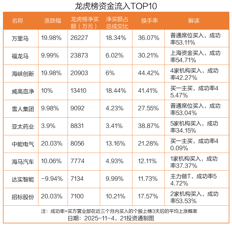 11月4日,上证指数下跌0.41%,深证成指下跌1.71%,创业板指下跌1.96%。盘后龙虎榜数据显示,共 有46只个股因当日异动登上龙虎榜,资金净流入最多的是万里马(300591.SZ),达2.62亿元。 据21投资通智能监测,26只个股龙虎榜出现了机构的身影,北向资金参与龙虎榜中的个股共涉及12只。 2.62亿资金抢筹万里马,3.65亿资金出逃常山药业 46只上榜的龙虎榜个股中,28只个股被净买入,18只个股被净卖出。其中,资金净买入最多的是万里 马,达2.62亿元,占总成交金额的18.34%。万里马当日收盘上涨19.98%,换手率为36.07%。 | 名称 | 涨跌幅 | 戊席榜净买 | 净买额占 | 换手率 | 解读 | | --- | --- | --- | --- | --- | --- | | | | 额(万元 | 总成交比 | | | | 万里马 | 19.98% | 26227 | 18.34% | 36.07% | 普通席位买入,成功 | | | | | | | 率53.11% | | 福龙马 | 9.99% | 23873 | 6.02% | 30.21% | 上海资金买入,成功 | | ...