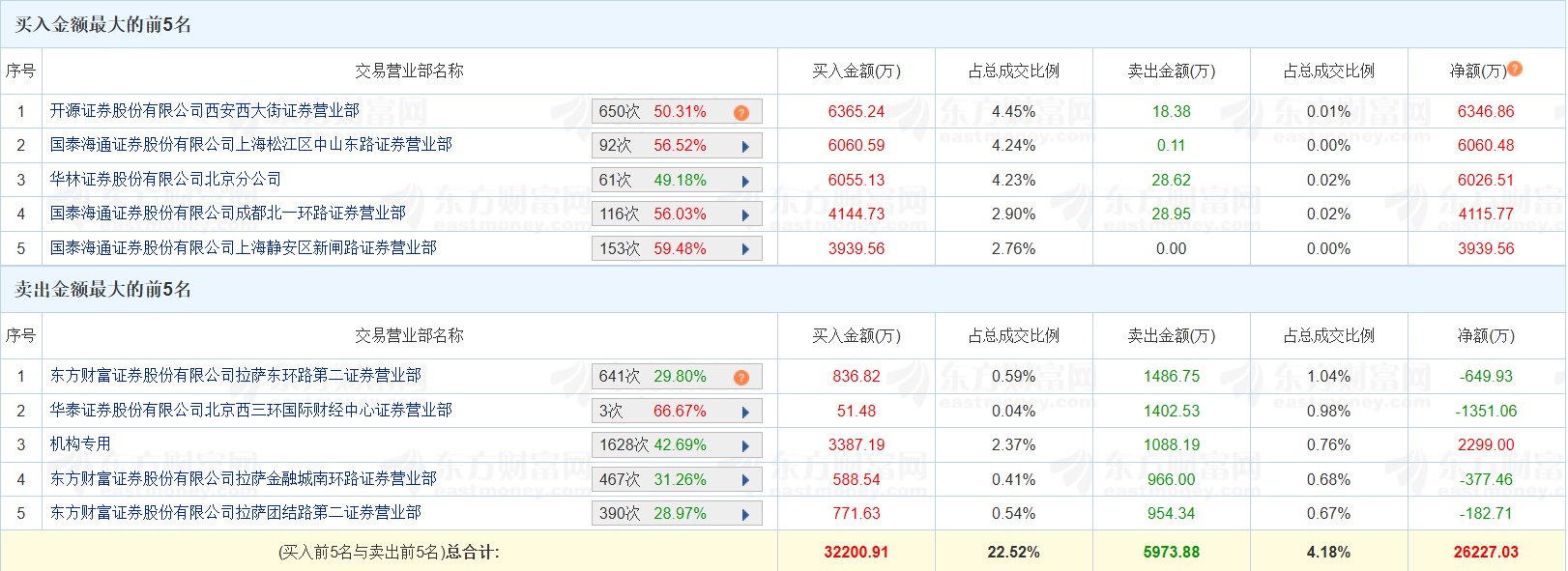 | 序号 | 交易营业部名称 | | | 买人金额(万) | 占息成交比例 | | --- | --- | --- | --- | --- | --- | | 1 | 开源证券股份有限公司西安西大街证券营业部 | 650次 50.31% | 2 | 6365.24 | 4.45% | | 2 | 国泰海通证券股份有限公司上海松江区中山东路证券营业部 | 56.52% 92次 | A | 6060.59 | 4.24% | | 3 | 华林证券股份有限公司北京分公司 | 61次 49.18% | ▲ | 6055.13 | 4.23% | | 4 | 国泰海通证券股份有限公司成都北一环路证券营业部 | 116次 56.03% | ▲ | 4144.73 | 2.90% | | 5 | 国泰海通证券股份有限公司上海静安区新闻路证券营业部 | 153次 59.48% | ▲ | 3939.56 | 2.76% | | | 卖出金额最大的前5名 | | | | | | 序号 | 交易营业部名称 | | | 买入金额(万) | 占总成交比例 | | 1 | 东方财富证券股份有限公司拉萨东环路第二证券营业部 | 641次 ...