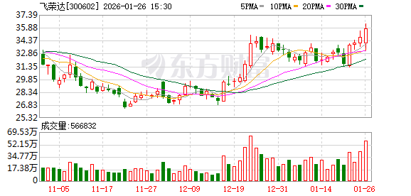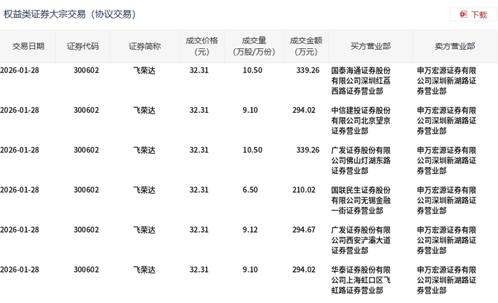1月28日,飞荣达大宗交易成交54.82万股,成交额1771.25万元,占当日总成交额的0.86%,成交价32.31 元,较市场收盘价36.31元折价11.02%。 | 交易日期 | 证券代码 | 证券简称 | 成交价格 | 成交量 | 成交金额 | 买方营业部 | 卖方营业部 | | --- | --- | --- | --- | --- | --- | --- | --- | | | | | (元) | (万股/万份) | (万元) | | | | 2026-01-28 | 300602 | 飞宋达 | 32.31 | 10.50 | 339.26 | 国泰海通证券股份 | 申万宏源证券有限 | | | | | | | | 有限公司深圳红荔 | 公司深圳新湖路证 | | | | | | | | 西路证券营业部 | 劳营业部 | | 2026-01-28 | 300602 | 飞荣达 | 32.31 | 9.10 | 294.02 | 中信建投证券股份 | 申万宏源证券有限 | | | | | | | | 有限公司北京里京 | 公司深圳新湖路证 | | | | | | | | 证券营业部 | 券营业部 | ...