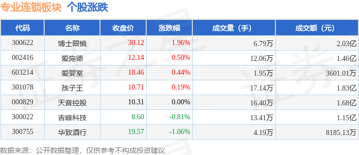 证券之星消息,11月17日专业连锁板块较上一交易日上涨0.13%,博士眼镜领涨。当日上证指数报收于 3972.03,下跌0.46%。深证成指报收于13202.0,下跌0.11%。专业连锁板块个股涨跌见下表: | 代码 | 名称 | 收盘价 | 涨跌幅 | 成交量(手) | 成交额(元) | | | --- | --- | --- | --- | --- | --- | --- | | 300622 | 博士眼镜 | 30.12 | 1.96% | 6.79万 | | 2.03亿 | | 002416 | 爰施德 | 12.14 | 0.50% | 12.06万 | | · 1.46/Z | | 603214 | 爱歌室 | 18.46 | 0.44% | 1.95万 | 3601.01万 | | | 301078 | 孩子王 | 10.71 | 0.19% | 17.14万 | | 1.83亿 | | 000829 | 天音控股 | 10.31 | 0.00% | 16.40万 | | 1.68亿 | | 300022 | 吉峰科技 | 8.60 | -0.81% | 13.41万 | | 1.15 Z | ...