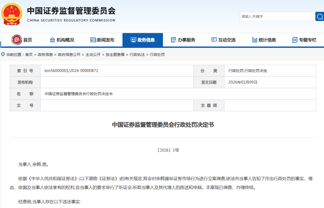 罚没10亿元!余韩操纵证券市场收证监会2026年1号罚单