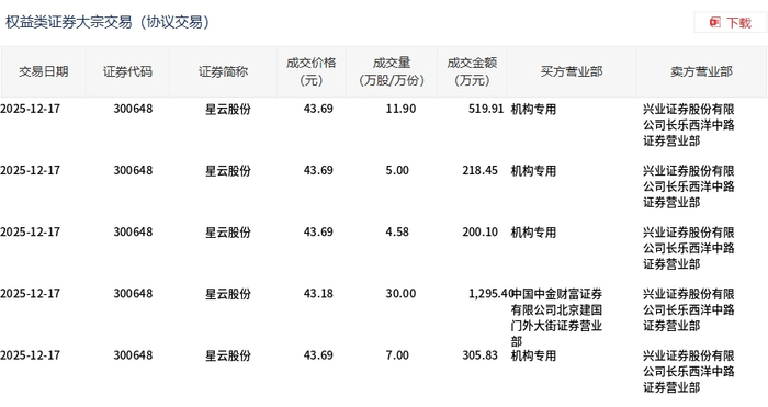 | 交易日期 | 证券代码 | 证券简称 | 成交价格 | 成交量 | 成交金额 买方营业部 | 卖方营业部 | | --- | --- | --- | --- | --- | --- | --- | | | | | (元) | (万股/万份) | (万元) | | | 2025-12-17 | 300648 | 星云股份 | 43.69 | 11.90 | 519.91 机构专用 | 兴业证券股份有限 | | | | | | | | 公司长乐西洋中路 | | | | | | | | 证券营业部 | | 2025-12-17 | 300648 | 星云股份 | 43.69 | 5.00 | 218.45 机构变用 | 兴业证券股份有限 | | | | | | | | 公司长乐西洋中路 | | | | | | | | 证券营业部 | | 2025-12-17 | 300648 | 星云股份 | 43.69 | 4.58 | 200.10 机构专用 | 兴业证券股份有限 | | | | | | | | 公司长乐西洋中路 | | | | | | | | 证券营业部 | | 2025-12-17 | 300648 | ...