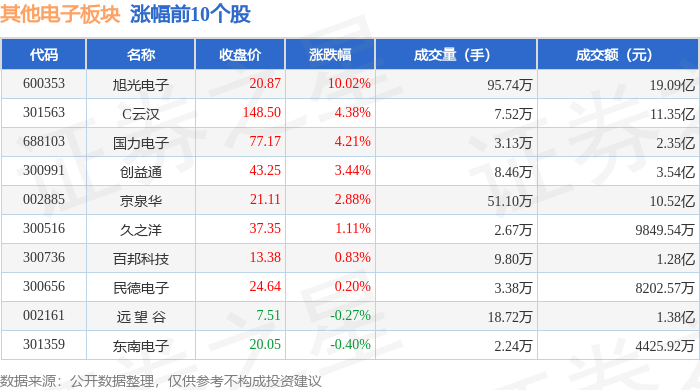 板块表现 - 其他电子板块当日上涨0.13% 领涨股为太龙股份涨幅13.46% [1] - 上证指数下跌0.01%至3853.3点 深证成指上涨0.67%至13445.9点 [1] - 板块内10只个股上涨 10只个股下跌 呈现分化态势 [1][2] 个股涨跌 - 涨幅前三位:太龙股份(300650)涨13.46%至20.73元 京泉华(002885)涨7.73%至18.95元 沃尔核材(002130)涨7.55%至34.19元 [1] - 跌幅前三位:自邦科技(300736)跌5.51%至12.85元 香农芯创(300475)跌5.20%至80.58元 好上好(001298)跌5.10%至34.02元 [2] - 成交额前三:沃尔核材107.67亿元 香农芯创32.96亿元 京泉华9.55亿元 [1][2] 资金流向 - 板块整体主力资金净流出2.94亿元 游资资金净流出3.95亿元 散户资金净流入6.89亿元 [2] - 主力资金净流入前三:沃尔核材8.77亿元(占比8.14%) 旭光电子1.00亿元(占比9.85%) 中熔电气4450.81万元(占比7.07%) [3] - 游资资金集中流出京泉华8635.71万元(占比-9.05%) 沃尔核材4.83亿元(占比-4.48%) [3]