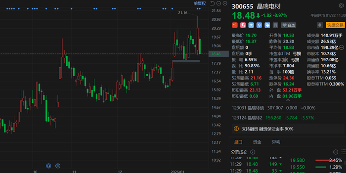 公司股价与市场表现 - 晶瑞电材股价在1月21日大涨并创下阶段新高后,于1月22日出现回撤,跌幅约9%,报收18.48元 [1] - 公司总市值跌破200亿元 [1] 公司股东行为 - 股东新银国际有限公司计划减持公司股份,拟减持数量不超过2145.94万股 [1] - 拟减持股份比例不超过公司总股本的2% [1] - 公告指出,拟减持股份数量不代表最终实际减持股份数 [1] 公司财务表现 - 公司前三季度营收为11.87亿元,同比增长11.92% [1] - 公司前三季度净利润为1.28亿元,同比增长19202.65% [1]