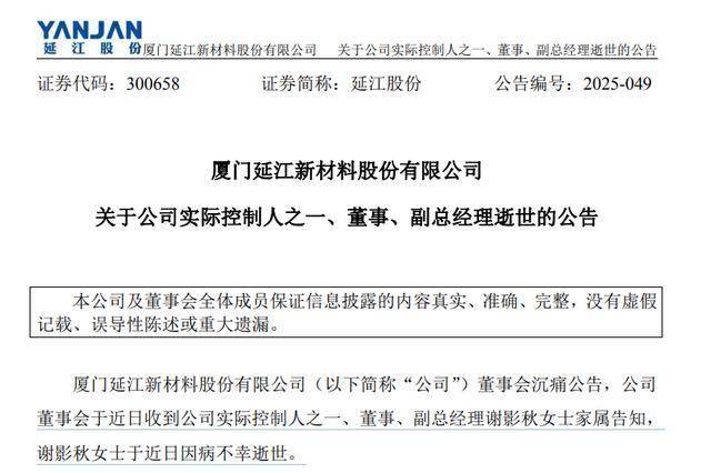 延江股份实控人之一、55岁女副总谢影秋因病逝世,系董事长和总经理胞妹