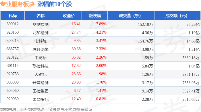 证券之星消息,1月22日专业服务板块较上一交易日上涨0.86%,科锐国际领涨。当日上证指数报收于 4122.58,上涨0.14%。深证成指报收于14327.05,上涨0.5%。专业服务板块个股涨跌见下表: | 代码 | 名称 | 收盘价 | 涨跌幅 | 成交量(手) | 成交额(元) | | --- | --- | --- | --- | --- | --- | | 300662 | 科院国际 | 30.81 | 7.09% | 15.01万 | 4.53亿 | | 688757 | 胜科纳米 | 32.80 | 6.70% | 8.29万 | 2.73亿 | | 920122 | 中纺标 | 36.73 | 5.27% | 2.87万 | 1.05亿 | | 300797 | 钢研纳克 | 18.75 | 4.05% | 13.88万 | 2.58亿 | | 300938 | 信测标准 | 31.04 | 3.99% | 12.37万 | 3.77亿 | | 300572 | 安车检测 | 29.50 | 3.98% | 9.83万 | 2.84亿 | | 301169 | 零点有数 | 64.59 | 2 ...