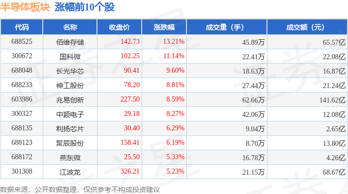 证券之星消息,11月13日半导体板块较上一交易日上涨1.59%,佰维存储领涨。当日上证指数报收于 4029.5,上涨0.73%。深证成指报收于13476.52,上涨1.78%。半导体板块个股涨跌见下表: | 代码 | 名称 | 收盘价 | 涨跌幅 | 成交量(手) | 成交额(元) | | | --- | --- | --- | --- | --- | --- | --- | | 688525 | 佰维存储 | 142.73 | 13.21% | 45.89万 | | 65.57 Z | | 300672 | 国科微 | 102.25 | 11.14% | 22.41万 | | 22.08亿 | | 688048 | 长光华芯 | 90.41 | 9.60% | 18.63万 | | 16.87亿 | | 688233 | 神工股份 | 78.20 | 8.81% | 27.44万 | | 21.24亿 | | 603986 | 兆易创新 | 227.50 | 8.59% | 62.66万 | | 141.62亿 | | 300327 | 中颖电子 | 29.18 | 8.27% | 42.06万 | | 1 ...