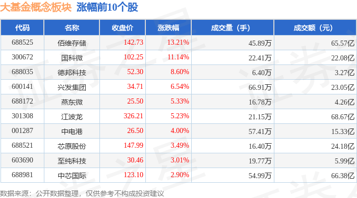 从资金流向上来看,当日大基金概念板块主力资金净流入6.05亿元,游资资金净流出3.85亿元,散户资金 净流出2.2亿元。大基金概念板块个股资金流向见下表: 证券之星消息,11月13日大基金概念板块较上一交易日上涨1.64%,佰维存储领涨。当日上证指数报收 于4029.5,上涨0.73%。深证成指报收于13476.52,上涨1.78%。大基金概念板块个股涨跌见下表: | 代码 | 名称 | 收盘价 | 涨跌幅 | 成交量(手) | 成交额(元) | | --- | --- | --- | --- | --- | --- | | 688525 | 佰维存储 | 142.73 | 13.21% | 45.89万 | 65.57亿 | | 300672 | 国科微 | 102.25 | 11.14% | 22.41万 | 22.08亿 | | 688035 | 德邦科技 | 52.30 | 8.60% | 6.40万 | 3.27亿 | | 600141 | 兴发集团 | 34.71 | 6.54% | 66.91万 | 23.05亿 | | 688172 | 燕东微 | 25.50 | 5.33% | 16.78万 ...