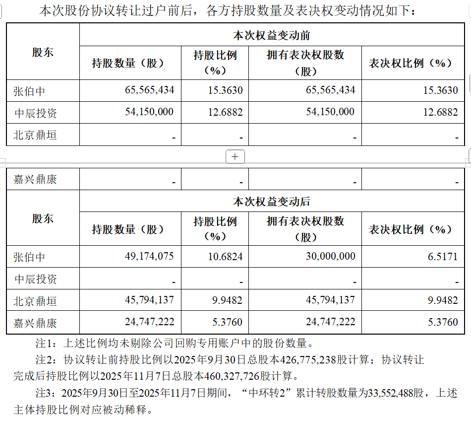 11月10日晚间,中环环保(300692)发布公告,公司今日收到张伯中先生及其一致行动人安徽中辰投资控股有限公司(简称"中辰投 资")、北京鼎垣企业管理咨询合伙企业(有限合伙)(简称"北京鼎垣")及嘉兴鼎康企业管理合伙企业(有限合伙)(简称"嘉兴鼎 康")通知,张伯中先生、中辰投资向北京鼎垣、嘉兴鼎康协议转让公司股份事项已在中国证券登记结算有限责任公司深圳分公司办理 过户登记手续,取得了《证券过户登记确认书》。 至此,公司控股股东变更为北京鼎垣,公司实际控制人变更为刘杨先生。 | 企业名称 | 嘉兴鼎康企业管理合伙企业(有限合伙) | | --- | --- | | 注册地址 | 浙江省嘉兴市南湖区东栅街道南江路1856号基金小镇信德园14幢1室 | | | 102-20 | | 执行事务合伙人 | 天津望鼎康健股权投资管理有限公司 | | 出资额 | 21.100.00万人民币 | | 统一社会信用代码 | 91330402MAET6Q6278 | | 成立时间 | 2025-08-05 | | 企业类型 | 有限合伙企业 | | 经营范围 | 一般项目:企业管理(除依法须经批准的项目外,凭营业执照依法自 ...