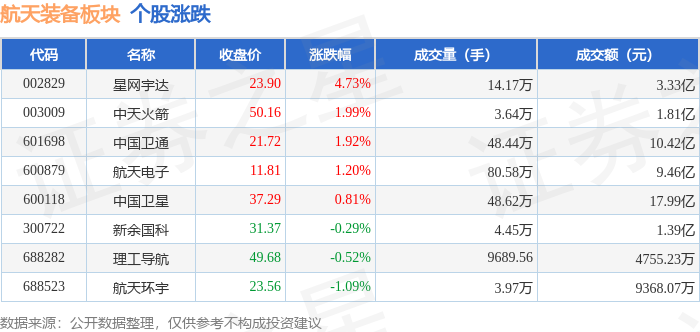 从资金流向上来看,当日航天装备板块主力资金净流出7586.83万元,游资资金净流出1424.2万元,散户 资金净流入9011.03万元。航天装备板块个股资金流向见下表: 以上内容为证券之星据公开信息整理,由AI算法生成(网信算备310104345710301240019号),不构成投资建议。 | 代码 | 名称 | 收盘价 | 涨跌幅 | 成交量(手) | 成交额(元) | | --- | --- | --- | --- | --- | --- | | 002829 | 星网宇达 | 23.90 | 4.73% | 14.17万 | 3.33 Z | | 003009 | 中天火箭 | 50.16 | 1.99% | 3.64万 | 1.81亿 | | 601698 | 中国 | 21.72 | 1.92% | 48.44万 | 10.42 乙 | | 600879 | 航天电子 | 11.81 | 1.20% | - 80.58万 | 9.46亿 | | 600118 | 中国卫星 | 37.29 | 0.81% | 48.62万 | 17.99亿 | | 300722 | 新余国科 | 31.37 | - ...