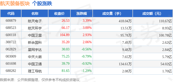 航天装备板块市场表现 - 2024年1月12日,航天装备板块整体较上一交易日大幅上涨10.02% [1] - 当日上证指数上涨1.09%,深证成指上涨1.75% [1] - 板块内多只个股表现强势,其中理工导航以20.00%的涨幅领涨,中国卫通、航天电子等四只个股涨停,涨幅均为10.00% [1] 领涨个股交易情况 - 理工导航收盘价为94.20元,成交量为3.97万手,成交额为3.59亿元 [1] - 航天环宇上涨13.99%,收盘价90.76元,成交额达19.26亿元 [1] - 中国卫通成交额最高,达138.23亿元,成交量262.95万手 [1] - 航天电子成交量最大,为403.76万手,成交额125.68亿元 [1] 板块资金流向 - 当日航天装备板块整体呈现主力资金净流入,净流入额为3.13亿元 [1] - 游资资金整体净流出4.55亿元,散户资金整体净流入1.42亿元 [1] - 个股资金流向分化明显,中国卫通主力净流入14.35亿元,占比达17.97%,而航天电子主力净流出6.26亿元,占比-4.98% [2] 个股资金流向详情 - 中国卫通主力资金大幅净流入14.35亿元,但游资和散户分别净流出7.99亿元和6.36亿元 [2] - 新余国科主力净流入6556.46万元,散户净流出6635.11万元 [2] - 航天环宇主力净流出8156.43万元,但游资净流入6375.99万元 [2] - 星网宇达主力与游资均呈净流出状态,分别为1881.42万元和973.91万元,但散户净流入2855.33万元 [2]