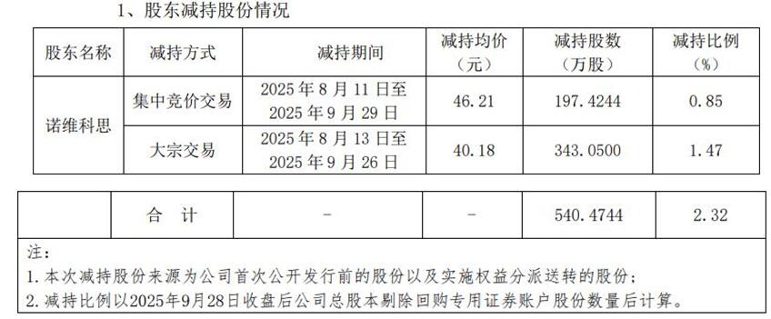 股东减持计划完成情况 - 南京诺维科思创业投资合伙企业(有限合伙)已完成其全部股份减持计划 [1] - 减持期间为2025年8月11日至2025年9月29日 [1] - 合计减持股份540.4744万股 [1] 具体减持交易细节 - 通过集中竞价交易减持197.4244万股,减持均价为46.21元/股 [1][2] - 通过大宗交易减持343.0500万股,减持均价为40.18元/股 [1][2] - 集中竞价交易减持比例为0.85%,大宗交易减持比例为1.47% [2] - 合计套现金额为2.29亿元 [1] 股东背景及关系 - 诺维科思为公司员工持股平台 [3] - 公司控股股东、实际控制人杨民民为诺维科思的执行事务合伙人 [3] - 杨民民与诺维科思为一致行动人关系 [3] 减持计划历史 - 公司于2025年7月10日预披露了本次减持计划 [3] - 原计划为减持其持有的全部公司股份 [3]