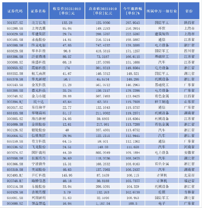 随着滴滴的正式入局,低空经济再度引爆市场。国泰海通证券认为,低空经济相关政策逐步细化,行业日渐走向 成熟。随着行业规模不断扩大,布局相关产业链的企业将率先受益,投资价值凸显。 多家上市公司布局eVTOL,股价翻倍 随着低空经济在国家战略中的地位不断提升,上市公司纷纷在这一领域加大布局力度。eVTOL(电动垂直起降飞 行器)作为低空经济的新载体,吸引众多上市公司争相进入这一赛道。 据报道,同花顺数据显示,目前A股低空经济概念一共有434家上市公司。从二级市场表现看,截至2025年10月10 日收盘,今年以来,已有33家上市公司股价成功实现翻倍。其中,北方长龙(301357.SZ)、上海洗霸 (603200.SH)、华建集团(600629.SH)3家公司股价涨幅均超过200%。 | 证券代码 | 证券名称 | 收盘价20251010 | 总市伯20251010 | 今年灌跌幅 | 所属甲万一级行业 | 省份 | | --- | --- | --- | --- | --- | --- | --- | | | | [单位]元 | [单位]亿元 | [单位]% | | | | 301357. SZ | 北方长龙 | 1 ...