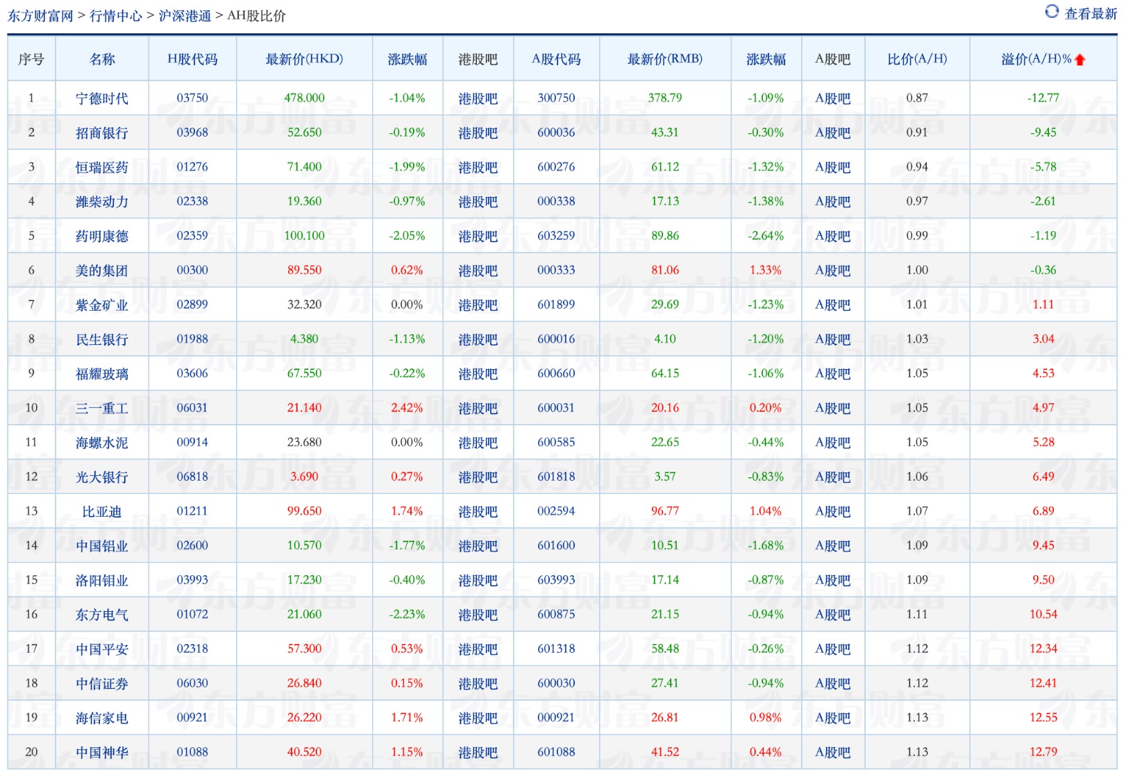 相比港股,A股有更低的交易成本,更好的市场流动性,A股相对H股有一定溢价,往往被投资者视为理所当然。 恒生AH股溢价指数(HSAHP)目前依然在120以上,显示整体A股相比H股有20%的溢价。然而,以宁德时代(300750.SZ,03750.HK)为代表的6家公司, 却出现了H股高于A股的反常现象。 业内人士认为,在海外资金主导的港股市场,这些公司有很大部分是2025年内刚上市的次新股,H股流通量比较小;另一方面,海外投资者对细分领域行业 龙头有更多的偏好,国际市场上也很难找到相应标的,使得这些个股出现了H股价较高,或者AH股价格比较贴近的情况。 从流动性看:"倒挂"次新股占比高,H股流通量小 公开信息显示,AH股价格"倒挂"的6家公司分别是:宁德时代、招商银行、恒瑞医药、潍柴动力、药明康德、美的集团;AH股价格比较贴近的则有紫金矿 业、民生银行、福耀玻璃、三一重工、海螺水泥、比亚迪等。 光大证券国际策略师伍礼贤向第一财经分析,H股比A股有溢价的个股,存在一个现象,就是H股的市值相较A股市值更小,有些甚至是A股的市值普遍是H 股市值的几倍甚至几十倍,流动性的相对稀缺性是导致股价"倒挂"的原因之一。 红蚁资本投 ...