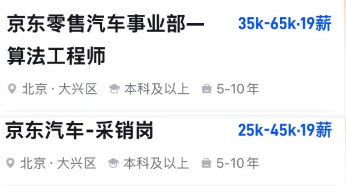 据悉,这款新车预估定价在10万元—12万元之间。广汽向21记者表示,广汽为京东用户量身打造了可充 电可换电的新款车型,该车型标配宁德时代巧克力电池。(21财经) 【#京东汽车多岗位年薪超百万#】官宣卖车后,京东开始"招兵买马"。10月15日晚,21世纪经济报道记 者在招聘平台脉脉上发现,目前京东汽车已释放多个岗位。其中,零售事业部算法岗年薪最高可达123 万元(35k—65k*19薪),对有汽车行业从业经历的候选人优先录取;汽车行业采销负责人年薪超过110 万元(45k—70k*16薪),需要具备5—10年相关经验,熟悉汽车零部件采购流程及供应链管理。 此前一天,京东宣布联合广汽集团、宁德时代旗下时代电服推出"国民好车",新车将于11月9日京东双 十一期间正式发布,并由京东独家销售。 ...