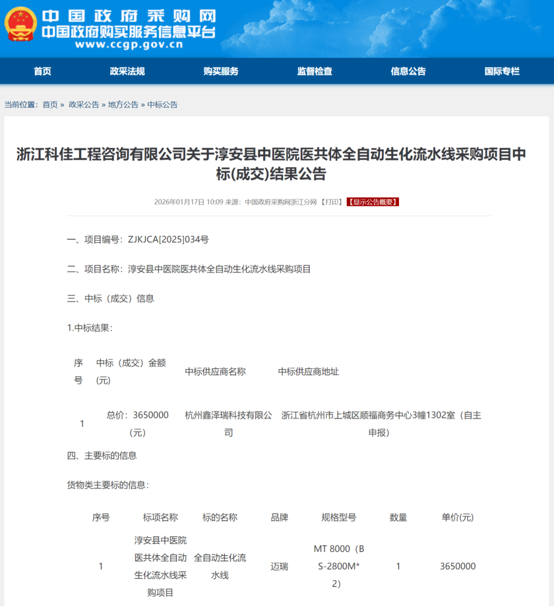 中标事件与产品信息 - 迈瑞医疗的全自动生化流水线MT 8000成功中标淳安县中医院医共体采购项目,成交单价为365万元 [1][3][4] - 中标供应商为杭州鑫泽瑞科技有限公司 [1][4] - 该流水线由迈瑞全自主研发,核心价值包括极致坪效比、智慧易用和多学科融合 [1][4] 产品性能与技术特点 - 流水线采用灵活的4轨道设计,单轨处理通量高达3600管/小时 [1][4] - 生化免疫设备与轨道直连,无需样本移载模块,实现样本全程单管直通 [1][4] - 样本进入分析仪的时间由原来的1分钟骤降至1秒,提升了处理超大样本量的能力 [1][4] - 支持智能识别样本质量,识别异常样本并自动做关联处理,实现检验过程动态互联与平衡 [1][4] - 精准把控样本质量可避免分析仪做额外的血清指数检测,减少了医疗资源浪费 [1][4] - 支持连接生化、免疫、凝血、血球等多学科设备,促进专业联合检测并构建跨学科自动审核平台 [1][4] - 搭载PDR光测平台、VU-Mix涡旋-超声混匀、PBRTQC等创新技术,旨在提高诊断准确性和治疗有效性 [1][4] 产品价值与市场定位 - 该产品从检测质量、工作效率、学科建设等全方位赋能检验学科,助力检验科室更新迭代 [1][4] - 产品设计实现了超高空间利用,从容面对超大样本量挑战 [1][4] - 推动医院医疗服务的高质量发展 [1][4] 采购方背景 - 采购方为淳安县中医院医共体,由淳安县中医院牵头与8家乡镇卫生院(含卫生室)于2018年组建 [2][5] - 淳安县中医院(杭州市中医院淳安分院)是一所三级乙等综合性中医院,集医疗、教学、科研、预防、保健、康复为一体,中医特色明显,综合实力雄厚 [2][5]