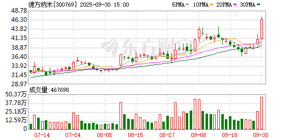 分红方面,德方纳米A股上市后累计派现3.07亿元。近三年,累计派现1.75亿元。 10月16日,德方纳米盘中上涨2.02%,截至09:39,报42.89元/股,成交8687.46万元,换手率0.82%,总 市值120.17亿元。 机构持仓方面,截止2025年6月30日,德方纳米十大流通股东中,香港中央结算有限公司位居第五大流 通股东,持股261.30万股,相比上期减少25.42万股。富国中证新能源汽车指数A(161028)位居第九大 流通股东,持股110.22万股,相比上期减少2.75万股。东方新能源汽车主题混合(400015)位居第十大 流通股东,持股108.40万股,为新进股东。汇添富中证新能源汽车产业指数(LOF)A(501057)退出十 大流通股东之列。 资金流向方面,主力资金净流出17.02万元,大单买入666.47万元,占比7.67%,卖出683.50万元,占比 7.87%。 责任编辑:小浪快报 德方纳米今年以来股价涨16.30%,近5个交易日跌4.69%,近20日涨3.20%,近60日涨34.87%。 资料显示,深圳市德方纳米科技股份有限公司位于广东省深圳市南山区留仙大道3370号南山智园崇文园 ...