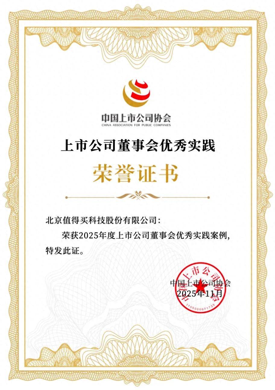 近日,中国上市公司协会正式揭晓"2025上市公司董事会最佳实践案例征集活动"评选结果。值得买科技凭借高质量的合规运作、 治理效能及战略决策能力,成功入选"2025上市公司董事会优秀实践案例",这已是公司连续三年蝉联此项荣誉。 上市公司董事会优秀实践 中国上市公司协会指出:健全上市公司董事会制度、提升战略决策与风险监督能力,已成为推动资本市场高质量发展、增强金融 体系韧性和服务实体经济能力的关键举措。从入围公司的实践来看,上市公司董事会在发挥战略引领作用、健全投资者关系管理 体系、加强内控制度建设、践行ESG理念等方面取得了显著成效。 作为此次"优秀实践案例"入选企业,值得买科技在多维度治理实践中展现出突出能力。在"内控制度建设"方面,公司不仅从制度 设计源头筑牢风险防控底线,更在治理结构、机构设置、权责分配及业务流程等关键环节构建起"相互制约、相互监督"的闭环运 行机制。通过持续推进现有制度修订与体系优化,为公司实现持续、健康、高质量发展提供了坚实保障。 在"投资者关系管理"方面,上市六年来,值得买科技凭借专业高效的投资者关系管理和高质量的信息披露工作,全面立体展现公 司商业模式独特价值与长期投资潜力,树立了 ...
