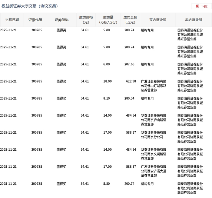 11月21日,值得买大宗交易成交111.5万股,成交额3859.02万元,占当日总成交额的2.06%,成交价 34.61元,较市场收盘价43.1元折价19.7%。 | 交易日期 | 证券代码 | 证券简称 | 成交价格 | 成交量 | 成交金额 | 买方营业部 | 卖方营业部 | | --- | --- | --- | --- | --- | --- | --- | --- | | | | | (元) | (万股/万份) | (万元) | | | | 2025-11-21 | 300785 | 值得买 | 34.61 | 5.80 | 200.74 | 机构专用 | 国泰海通证券股份 | | | | | | | | | 有限公司济南泉城 | | | | | | | | | 路正券营不部 | | 2025-11-21 | 300785 | 值得益 | 34.61 | 5.80 | 200.74 | 机构专用 | 国泰海通证券股份 | | | | | | | | | 有限公司济南泉城 | | | | | | | | | 路证券营业部 | | 2025-11-21 | 300785 | 值得买 | 34.61 | ...