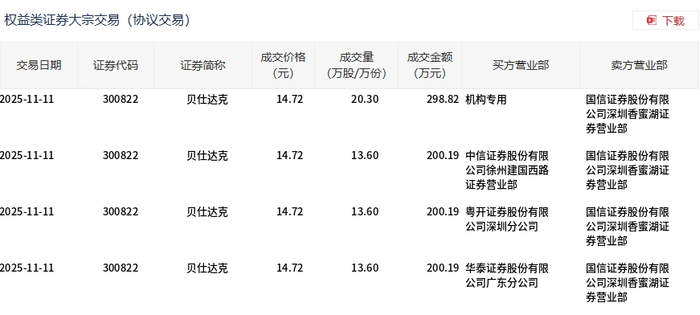 大宗交易概况 - 2025年11月11日,贝仕达克发生大宗交易,总成交量为61.1万股,总成交额为899.39万元,占当日总成交额的6.62% [1] - 成交价格为14.72元,较当日市场收盘价17.29元折价14.86% [1] 交易明细分析 - 当日共发生4笔大宗交易,每笔成交价格均为14.72元 [2] - 单笔成交量分别为20.30万股、13.60万股、13.60万股和13.60万股 [2] - 单笔成交金额分别为298.82万元、200.19万元、200.19万元和200.19万元 [2] - 所有交易的卖方营业部均为国信证券股份有限公司深圳香蜜湖证券营业部 [2] 交易参与方 - 买方营业部分别为机构专用、中信证券股份有限公司徐州建国西路证券营业部、粤开证券股份有限公司深圳分公司和华泰证券股份有限公司广东分公司 [2]