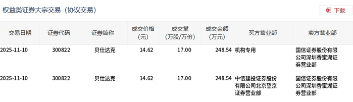 大宗交易概况 - 2025年11月10日,贝仕达克发生大宗交易,总成交量34万股,总成交额497.08万元,占当日总成交额的11.86% [1] - 成交价格为14.62元,较市场收盘价16.92元折价13.59% [1] 交易明细分析 - 当日共发生两笔大宗交易,每笔成交量均为17万股,每笔成交额均为248.54万元 [2] - 两笔交易成交价格均为14.62元 [2] - 买方分别为机构专用席位和中信建投证券股份有限公司北京望京证券营业部 [2] - 两笔交易的卖方均为国信证券股份有限公司深圳香蜜湖证券营业部 [2]