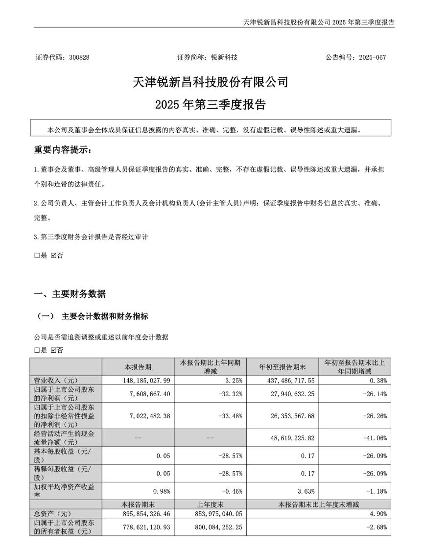 锐新科技(300828.SZ):第三季度净利润同比下降32.32%