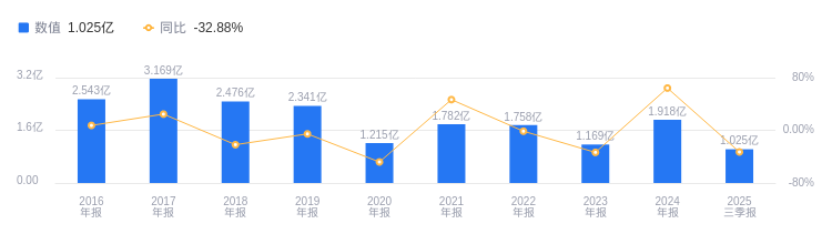 公司财务表现 - 2025年前三季度公司营收约1.02亿元,同比大幅减少32.88% [1] - 2025年前三季度归属于上市公司股东的净利润约2011万元,同比大幅下降61.73% [1] - 2025年前三季度基本每股收益为0.0628元,同比大幅减少61.75% [1]   公司市值信息 - 截至发稿,公司市值为46亿元 [2]