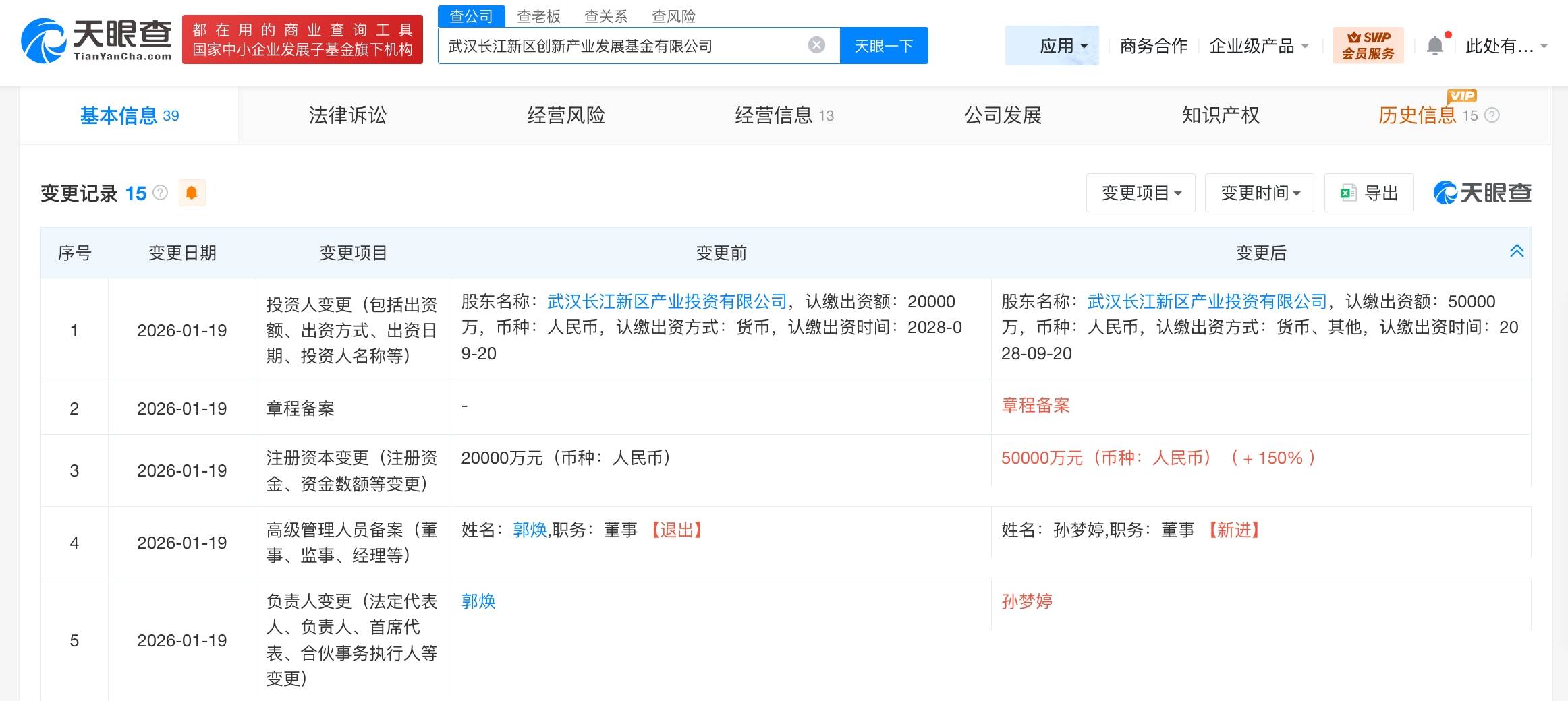 公司工商变更与资本变动 - 武汉长江新区创新产业发展基金有限公司注册资本由2亿人民币大幅增至5亿人民币,增幅达150% [1] - 公司法定代表人及部分主要人员也发生变更 [1] - 公司成立于2023年9月,法定代表人为孙梦婷,经营范围包括创业投资、以自有资金从事投资活动、自有资金投资的资产管理服务及融资咨询服务 [1] 公司股权结构与背景 - 该公司由武汉长江新区产业投资有限公司全资持股 [1]