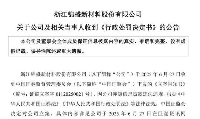 锦盛新材关联交易事项处罚落定