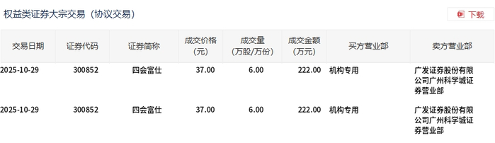 | 交易日期 | 证券代码 | 证券简称 | 成交价格 | 成交量 | 成交金额 | 买方营业部 | 卖方营业部 | | --- | --- | --- | --- | --- | --- | --- | --- | | | | | (元) | (万股/万份) | (万元) | | | | 2025-10-29 | 300852 | 四会富仕 | 37.00 | 6.00 | 222.00 机构专用 | | 广发证券股份有限 | | | | | | | | | 公司广州科学城证 | | | | | | | | | 劳营业部 | | 2025-10-29 | 300852 | 四会富仕 | 37.00 | 6.00 | 222.00 机构专用 | | 广发证券股份有限 | | | | | | | | | 公司广州科学城证 | | | | | | | | | 券营业部 | 10月29日,四会富仕大宗交易成交12万股,成交额444万元,占当日总成交额的1.24%,成交价37元, 较市场收盘价40.87元折价9.47%。 ...