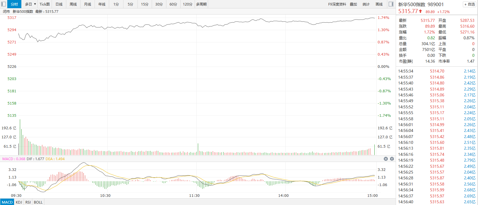 新华500指数(989001)9日涨1.72%