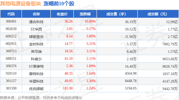 证券之星消息,10月31日其他电源设备板块较上一交易日下跌1.24%,欧陆通领跌。当日上证指数报收 于3954.79,下跌0.81%。深证成指报收于13378.21,下跌1.14%。其他电源设备板块个股涨跌见下表: | 代码 | 名称 | 收盘价 | 涨跌幅 | 成交量(手) | 成交额(元) | | | --- | --- | --- | --- | --- | --- | --- | | 300491 | 通合科技 | 36.26 | 10.89% | 36.19万 | | 12.99亿 | | 002630 | ST华西 | 3.05 | 5.17% | 59.52万 | | 1.77亿 | | 600212 | 绿能氯充 | 8.54 | 3.89% | 31.98万 | | 2.73亿 | | 002951 | 金时科技 | 14.77 | 3.21% | 5.37万 | | 7882.79万 | | 300713 | 英可瑞 | 18.56 | 3.11% | 8.46万 | | 1.57亿 | | 688551 | 科威尔 | 41.10 | 2.11% | 2.18万 | | 9053.68万 ...
