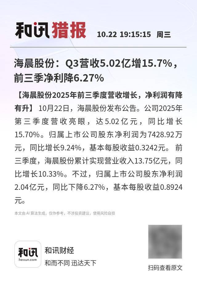 海晨股份:Q3营收5.02亿增15.7%,前三季净利降6.27%