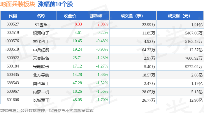 板块整体表现 - 10月22日地面兵装板块整体下跌1.34%,表现弱于大盘,当日上证指数下跌0.07%,深证成指下跌0.62% [1] - 板块内个股普遍下跌,在统计的10只个股中,仅1只上涨,9只下跌 [1] 个股价格表现 - 捷强装备领跌板块,跌幅达5.28%,收盘价为43.78元 [2] - 北方长龙跌幅次之,为5.06%,收盘价为135.02元 [2] - ST应急为板块内唯一上涨个股,涨幅2.08%,收盘价为8.33元 [1] 资金流向 - 地面兵装板块整体呈现主力资金和游资净流出,主力资金净流出4.79亿元,游资资金净流出1.02亿元 [2] - 散户资金呈现净流入状态,净流入金额为5.81亿元,与主力资金流向形成对冲 [2] - 内蒙一机主力资金净流出最多,达7930.59万元,主力净占比为-15.38% [3] - 中兵红箭主力资金净流出7401.05万元,主力净占比为-5.89% [3] - ST应急是主力资金唯一净流入的个股,净流入2131.60万元,主力净占比为11.14% [3] 成交活跃度 - 中兵红箭成交最为活跃,成交额达12.57亿元,成交量64.32万手 [1] - 长城军工成交额最高,达12.90亿元,成交量26.77万手 [1][2] - 北方导航成交额也较高,为2.66亿元,成交量18.57万手 [1]
