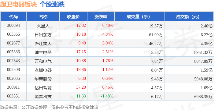 厨卫电器板块市场表现 - 1月12日,厨卫电器板块整体上涨1.92%,表现强于大盘,当日上证指数上涨1.09%,深证成指上涨1.75% [1] - 板块内个股普涨,火星人以6.48%的涨幅领涨,日出东方上涨4.84%,浙江美大上涨3.04%,帅丰电器上涨2.51%,万和电气上涨1.76%,老板电器上涨1.12%,华帝股份上涨0.64%,亿田智能上涨0.46%,仅奥普科技下跌1.48% [1] 板块个股交易情况 - 火星人成交额达2.46亿元,成交量为19.37万手,收盘价为12.82元 [1] - 日出东方成交额达6.22亿元,为板块内最高,成交量为61.99万手,收盘价为10.18元 [1] - 浙江美大成交额达4.35亿元,成交量为46.27万手,收盘价为9.49元 [1] - 帅丰电器成交额为8951.32万元,成交量为5.28万手,收盘价为17.15元 [1] - 老板电器成交额达1.59亿元,收盘价为19.86元 [1] - 亿田智能成交额达1.69亿元,收盘价为37.20元,为板块内最高股价 [1] 板块资金流向 - 当日厨卫电器板块整体呈现主力资金净流入,净流入金额为7408.69万元,而游资资金净流出3442.44万元,散户资金净流出3966.24万元 [1] - 日出东方获得主力资金大幅净流入6016.44万元,主力净流入占比达9.68%,是板块内主力资金流入最多的个股 [2] - 浙江美大获得主力资金净流入2017.97万元,主力净流入占比为4.64% [2] - 火星人获得主力资金净流入574.53万元,主力净流入占比为2.34% [2] - 亿田智能遭遇主力资金净流出1343.56万元,主力净流出占比达7.95%,是板块内主力资金流出最多的个股 [2] - 老板电器遭遇游资资金净流出1612.36万元,游资净流出占比达10.13% [2]