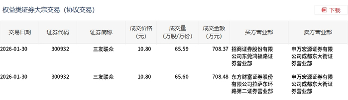 大宗交易概况 - 2026年1月30日,三友联众发生大宗交易,总成交131.19万股,总成交金额1416.85万元,占该股当日总成交额的9.65% [1] - 本次大宗交易成交价格为10.80元,较当日市场收盘价13.33元折价18.98% [1] 交易明细分析 - 当日共发生两笔大宗交易,每笔成交价格均为10.80元 [2] - 第一笔成交65.59万股,成交金额708.37万元,买方为招商证券股份有限公司东莞鸿福路证券营业部,卖方为申万宏源证券有限公司成都东大街证券营业部 [2] - 第二笔成交65.60万股,成交金额708.48万元,买方为东方财富证券股份有限公司拉萨东环路第二证券营业部,卖方同样为申万宏源证券有限公司成都东大街证券营业部 [2] - 两笔交易卖方营业部相同,合计成交量与总成交量131.19万股相符 [1][2]
