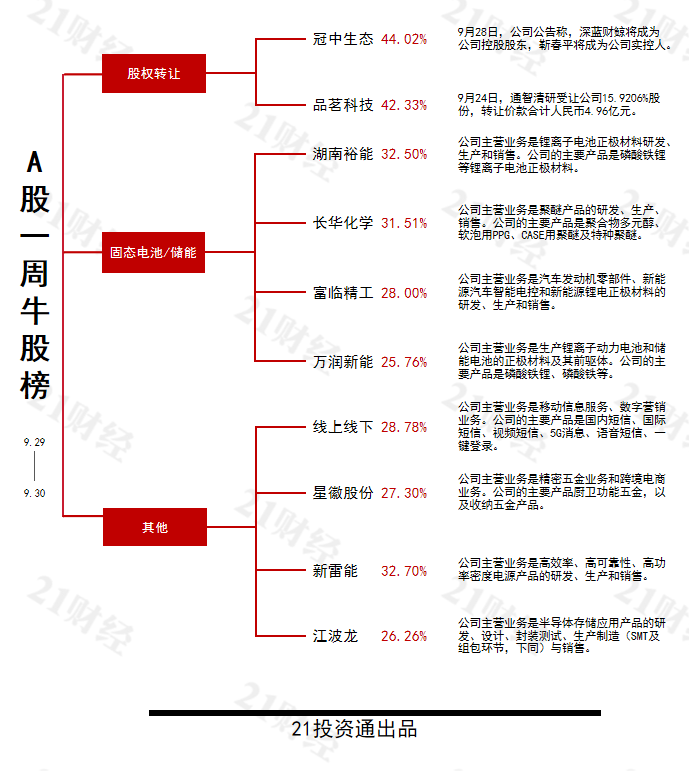 国庆假期前的两个交易日(9月29日—9月30日),A股三大指数集体上涨。截至9月30日收盘,上证指 数报3882.78点,周涨1.43%;深成指报13526.51点,周涨2.40%;创业板指报3238.16点,周涨2.75%。 控股股东拟变更为深蓝财鲸,最牛股冠中生态20CM二连板 本期牛股榜中,冠中生态(300948.SZ)以44.02%的周涨幅夺魁,品茗科技(688109.SH)以42.33%的 涨幅位居第二,新雷能(300593.SZ)、湖南裕能(301358.SZ)、长华化学(301518.SZ)周涨幅超 30%。本期牛股榜十只个股本周累计涨幅均超过25%。 最牛股冠中生态属于园林工程行业: 公开资料显示,公司主营业务是生态环境建设,覆盖包括植被恢复、水土保持、防沙治沙、土壤修复、 土地整治、水环境治理等自然环境生态修复业务,以及景观园林、市政工程、环卫保洁等人工环境生态 建设业务。 二级市场方面,冠中生态自9月29日复盘后,连续收获2个20CM一字板,累计涨幅达44.02%,截至9月 30日收盘,股价报16.13元/股,总市值23亿元。 消息面上,近日,冠中生态公告称控股股东拟变更为深蓝财鲸,后者实 ...