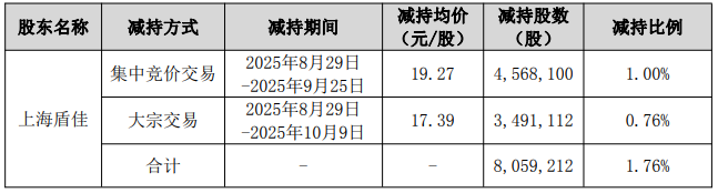 中洲特材10日发布关于持股5%以上股东权益变动触及1%暨减持股份计划实施完毕的公告。近日,公司 收到控股股东、实际控制人冯明明及其一致行动人上海盾佳出具的《关于持股5%以上股东权益变动触 及1%暨减持股份计划实施完毕的告知函》,获悉冯明明及其一致行动人上海盾佳持有公司股份比例变 动触及1%的整数倍,且上海盾佳减持计划已实施完毕。 本次减持计划的实施不会导致公司控制权发生变化,也不会对公司治理结构及持续经营产生影响。 中洲特材于2021年4月9日在深圳证券交易所创业板上市,本次公开发行股票3,000.000万股,本次公开发 行的价格为12.13元/股。保荐机构(主承销商)为安信证券股份有限公司,保荐代表人为孙素淑、肖江 波。 上海盾佳因持股平台股东资金需求在2025年9月16日至2025年10月9日期间,通过集中竞价交易方式累计 减持其持有的公司股份1,139,400股,通过大宗交易方式累计减持其持有的公司股份3,088,112股,在此期 间合计减持股份占公司总股本的0.92%,公司控股股东、实际控制人冯明明及其一致行动人上海盾佳持 有公司股份比例从41.83%下降至40.91%,变动触及1%的整数倍。 | 股 ...