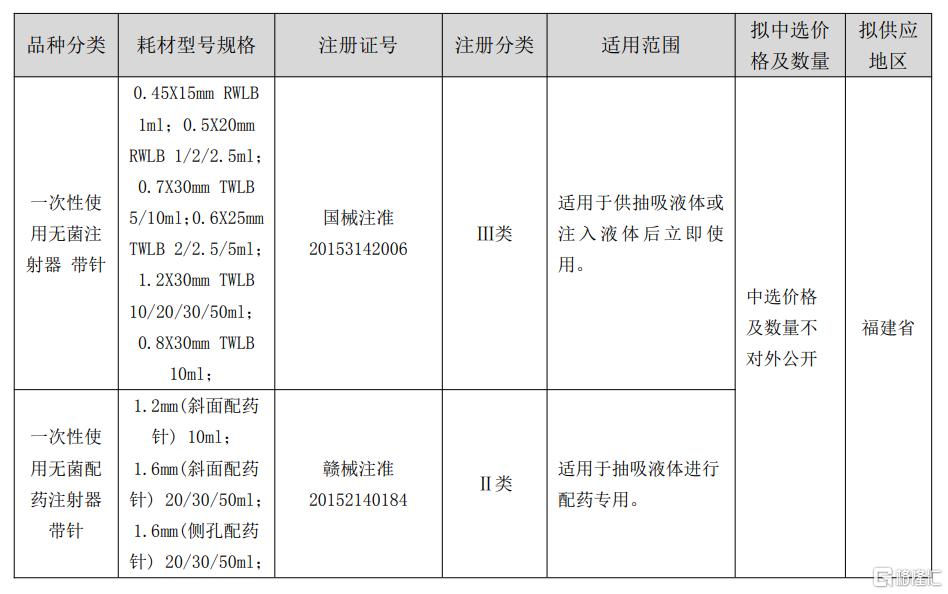 格隆汇9月29日丨中红医疗(300981.SZ)公布,控股子公司江西科伦医疗器械制造有限公司(简称"科伦医械")于近期参加福建省漳州市 一次性使用压力延长管、注射器全省性联盟集中带量采购项目的投标工作。根据福建省漳州市一次性使用压力延长管、注射器全省性 联盟集中带量采购公告(第6号)显示,科伦医械部分产品拟中选上述集中带量采购项目。 科伦医械注射器2024年度销售收入为6413万元,占科伦医械2024年度营业收入的34.84%,占公司2024年度营业收入的2.61%。科伦医械 上述拟中选产品的采购周期内,采购地区的医疗机构将优先使用公司拟中选产品,并确保完成约定采购量,后续签订购销合同并实施 后,将有利于进一步扩大中选产品的市场销售,提高市场占有率,提升品牌影响力,对公司长远发展产生积极影响。 | 品种分类 | 耗材型号规格 | 注册证号 | 注册分类 | 适用范围 | 拟中选价 格及数量 | 拟供应 地区 | | --- | --- | --- | --- | --- | --- | --- | | | 0. 45X15mm RWLB 1ml; 0.5X20mm | | | | | | | | RWLB 1 ...