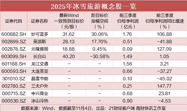 11月4日,冰雪旅游板块持续走强,晶雪节能(301010.SZ)涨超10%领涨,雪人集团(002639.SZ)、 大连亚圣(600593.SH)双双涨停。 世纪证券表示,当前我国冰雪产业链已形成"上游资源开发与装备生产、中游服务运营、下游消费及衍 生经济"的完整生态,产业链上下游标的均有望受益于"冷资源转热经济"进程。建议关注基础设施建设 (滑雪场改造、场馆设备制造)、冰雪装备产业(滑雪装备研发生产)、冰雪运动培训及赛事运营三大 投资方向。 21财经·南财快讯记者梳理发现,冰雪旅游板块近一年涨幅近70%,其中,大连圣亚近一年涨幅近 180%,晶雪节能近一年涨幅超100%。截至11月4日收盘,妙可蓝多(600882.SH)、英派斯 (002899.SZ)较Wind最新一致预测目标价仍有一定涨幅空间,热门股长白山(603099.SH)股价已超 前述目标价30.58%。 | | | | 2025年冰雪旅游概念股一览 | | | | --- | --- | --- | --- | --- | --- | | 证券代码 | 证券名称 | 最新Wind 致预测目标价 | 距目标价 涨幅空间 | 前一李度 归母净利润 | ...